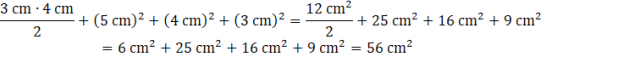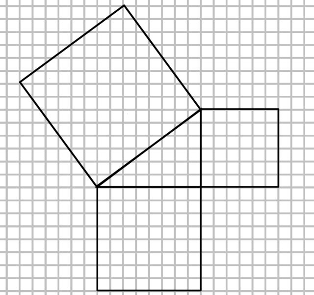 Kratka na rysunku ma bok długości 5 mm. Narysuj dwa odcinki o długości 3 cm i 4 cm, które mają jeden wspólny koniec i tworzą kąt prosty. Połącz pozostałe końce tych odcinków, żeby skonstruować trójkąt z zadania. Następnie narysuj kwadraty przy użyciu linijki i ekierki, tak jak na rysunku. Ich wierzchołki powinny znajdować się w punktach przecięcia kratek. Żeby policzyć pole narysowanej figury, dodaj do siebie pola kwadratów i trójkątów, z których się ona składa.