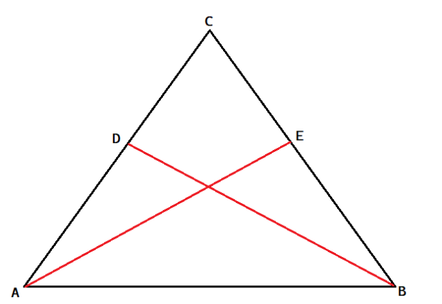 Trójkąty ACE oraz BDC są przystające na mocy zasady kąt – bok – kąt (każdy z trójkątów ma jeden kąt prosty i jeden kąt ACB oraz długości ramion AC i BC są równe). Z tego wynika, że długości odpowiadających sobie boków, a w szczególności BD i AE, które są wysokościami trójkąta, są sobie równe, co należało wykazać.