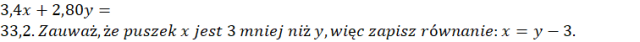 Podstaw za x ilość kupionych „Łasuchów”, a za y ilość kupionych „Smaczków” i ułóż równania. Zauważ, że jeżeli pomnożysz ilość puszek x razy ich cenę i dodasz do tego pomnożoną ilość puszek y razy ich cenę, to otrzymasz całkowity koszt zakupu: