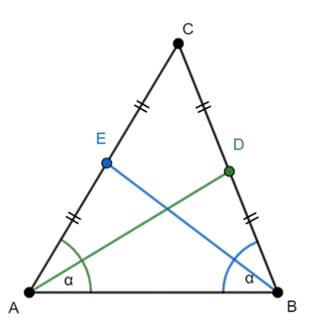 a) bok: |AE| = |BD|–punkty E i E to połowy odcinków, boków odpowiednio |AC| i |BC|