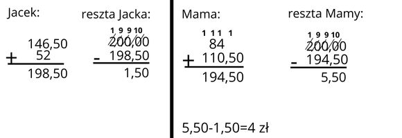 Oblicz, kto otrzymał więcej (o ile) reszty z 200 zł.