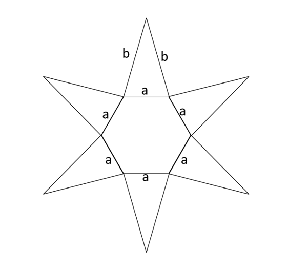 Siatkę ostrosłupa można narysować na kilka sposobów. W tym podpunkcie musisz narysować siatkę ostrosłupa prawidłowego sześciokątnego. Zacznij od narysowania podstawy – sześciokąta foremnego o boku a. Następnie do każdej krawędzi podstawy dorysuj trójkąt równoramienny o długości ramienia b.