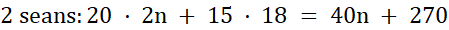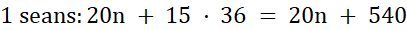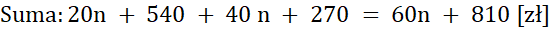 Oblicz łączną sumę pieniędzy ze sprzedaży wszystkich biletów, jeśli cena biletu normalnego wynosi 20 zł a ulgowego 15 zł oraz że na pierwszy seans sprzedano n biletów normalnych i 16 ulgowych, a na drugi – dwukrotną ilość normalnych i dwukrotnie mniej ulgowych.