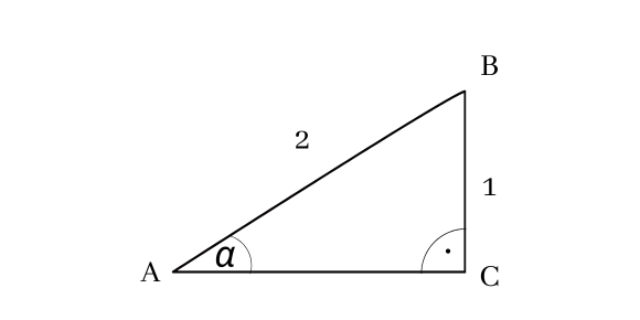 Sinus kąta ostrego jest to stosunek długości przyprostokątnej leżącej naprzeciwko tego kąta do długości przeciwprostokątnej. W pierwszej kolejności musisz narysować kąt prosty (o wierzchołku C). Następnie odmierzamy długość jednej jednostki i zaznaczamy wierzchołek B. Potem z punktu B, cyrklem zaznaczamy okrąg o promieniu 2. Na końcu łączymy powstałe punkty, tworząc kąt ostry.