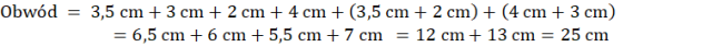 W sześciokącie musisz zliczyć wszystkie boki. Długi pionowy odcinek jest równy sumie długości odcinków 2 cm i 3,5 cm. Poziomy odcinek jest sumie długości odcinków 3 cm i 4 cm.