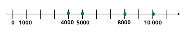 Podziałka wynosi 1000, dlatego poruszając się w prawo na osi liczbowej, dodajemy 1000 do poprzedniej liczby. Na tej podstawie zaznacz podane liczby na osi.