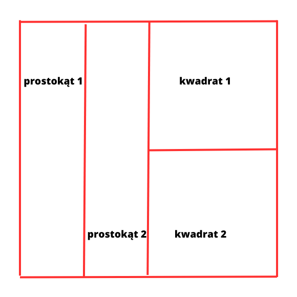 W tym zadaniu musisz podzielić przedstawiony na ilustracji kwadrat na: dwa kwadraty i dwa, niebędące kwadratami, prostokąty.