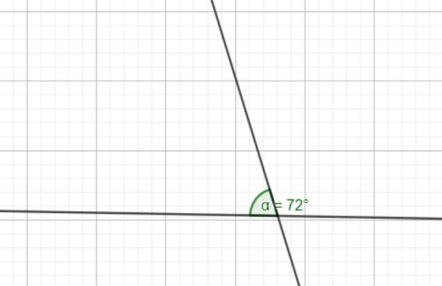 Zauważ, że tak przecinające się proste tworzą dwa kąty przyległe i jeden wierzchołkowy do zaznaczonego kąta. Kąty wierzchołkowe mają równe miary. Miary kątów przyległych sumują się do