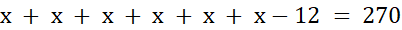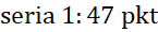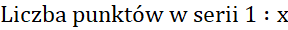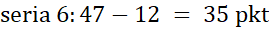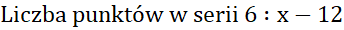 Oblicz liczbę punktów w każdej z serii pani Justyny, jeśli w pierwszych pięciu seriach zdobyła tyle samo punktów, w szóstej serii o 12 mniej, a łącznie uzyskała 270 pkt.