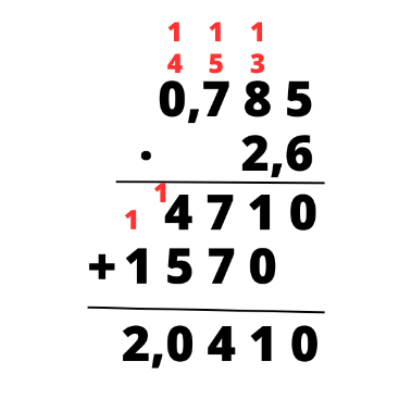 Mnożąc sposobem pisemnym, należy przemnożyć każdą liczbę znajdującą się na górze zapisu przez liczby na dole. Wyniki mnożenia zapisuj pod kreską, zaczynając od miejsca pod liczbą, przez którą mnożyłeś. Jeśli wynik jest dwucyfrowy, zapisz cyfrę jedności pod kreską, a cyfrę dziesiątek dodaj do następnego wyniku mnożenia. Następnie wykonaj dodawanie i przesuń przecinek o odpowiednią ilość miejsc. W tym przypadku po przecinku znajdują się cztery cyfry, więc w wyniku także muszą znajdować się cztery cyfry. Ostatnie zero można pominąć.