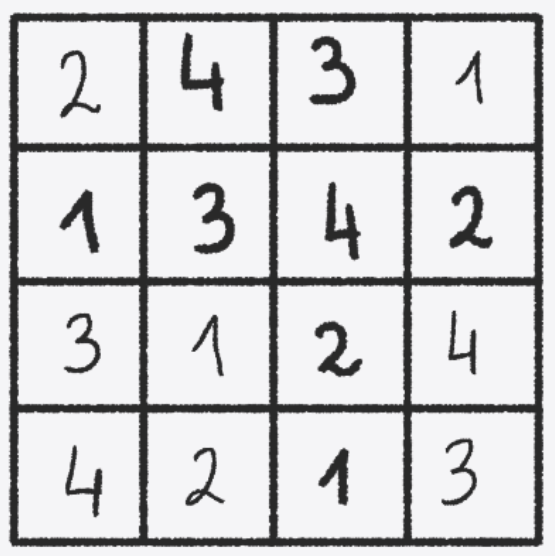 W tym zadaniu musisz uzupełnić tabelki tak, aby w każdym rzędzie i kolumnie każda liczba 1, 2, 3, 4 występowała dokładnie raz.