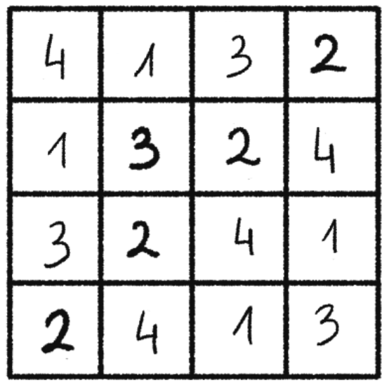 W tym zadaniu musisz uzupełnić tabelki tak, aby w każdym rzędzie i kolumnie każda liczba 1, 2, 3, 4 występowała dokładnie raz.