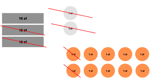 Banknot 10 zł rozmień na 10 monet po 1 zł, a następnie skreśl 14 zł. Zauważ, że pozostanie 18 zł.