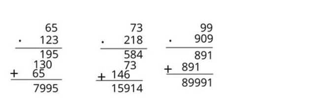 Oblicz sposobem pisemnym 65 ×123, 73 ×218, 909 ×99.