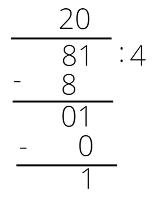 Sprawdź, ile razy mieści się pierwsza cyfra w dzielniku. Wynik zapisz nad kreską nad naszą cyfrą. Pomnóż zapisaną liczbę przez dzielnik i zapisz wynik pod pierwszą cyfrą. Zapisz pod tą liczbą kreskę i odejmij powyższe dwie liczby. Do uzyskanego wyniku dopisz kolejną cyfrę dzielnej i znowu sprawdź, ile razy mieści się ta liczba w dzielniku. Wynik zapisz nad kreską nad naszą cyfrą. Pomnóż zapisaną liczbę przez dzielnik i zapisz wynik pod drugą cyfrą. Zapisz pod tą liczbą kreskę i odejmij powyższe dwie liczby. Jeśli różnica jest różna od zera, to jest to reszta z dzielenia.
