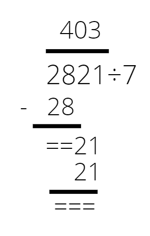 Sprawdź, ile razy mieści się 7 w 28. Odpowiedź to 4. Wpisujemy ją ponad kreskę od prawej strony. Mnożymy otrzymaną czwórkę razy dzielnik i wpisujemy od prawej strony pod dzielną. Odejmujemy i widzimy, że reszta z tego dzielenia to 0. Wpisujemy nad kreską zero i „zrzucamy” dwie cyfry z dzielnej. Sprawdź, ile razy w powstałej liczbie zmieści się siedem. Odpowiedź to 3.