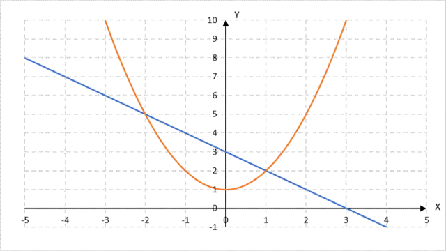 Punkt przecięcia prostych to (–2, 5) oraz (1, 2).