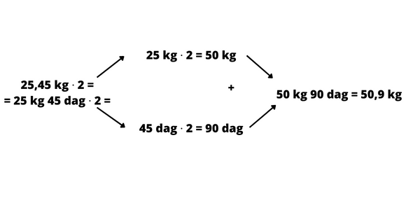 Uzupełnij graf na podstawie przykładu podanego w zadaniu. Wykonaj mnożenie osobno dla większych jednostek i osobno dla mniejszych jednostek składowych, np. kg i dag. Po wymnożeniu składników wykonaj dodawanie i wpisz wynik sumy w dwóch postaciach.