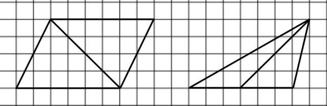 Równoległobok podzielono na trójkąty o boku 3 cm i wysokości 2 cm. Trójkąt podzielono na 2 trójkąty rozwartokątne o podstawie 1,5 cm i takiej samej wysokości.