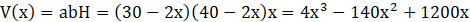 Z arkusza, w kształcie prostokąta o wymiarach 30 cm × 40 cm, wycięto w narożnikach kwadraty o bokach długości x cm. Pozostałą część sklejono i otrzymano pudełko. Opisz objętość pudełka za pomocą wielomianu zmiennej x i określ dziedzinę tej funkcji.