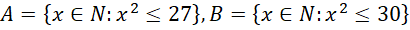 Wypisz elementy obu podanych zbiorów czyli liczby naturalne których kwadraty są mniejsze lub równe 27 oraz mniejsze lub równe 30.