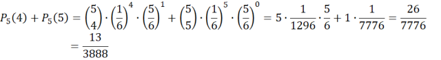 Wyznacz prawdopodobieństwo tego, że przy pięciokrotnym rzucie kostką otrzymamy co najmniej cztery szóstki