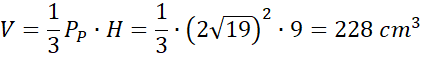 Wyznacz objętość ostrosłupa prawidłowego czworokątnego o wysokości równej 9, jeśli cosinus kąta między wysokością tego ostrosłupa, a wysokością jego ściany bocznej jest równy 0,9.
