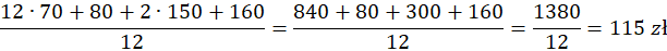 Aby obliczyć średnią arytmetyczną otrzymanych pieniędzy przez Marcina w przeciągu roku zsumuj wszystkie pieniądze jakie otrzymał: 12 razy 70 zł od rodziców, raz 80 zł, dwa razy 150 zł i raz 160 zł od dziadków, a następnie podziel ją przez liczbę miesięcy w roku.