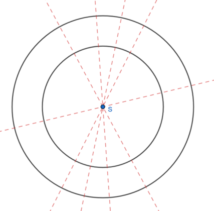 Zauważ, że dwa okręgi o wspólnym środku mają nieskończenie wiele osi symetrii, a ich środek symetrii znajduję się w środku okręgów.