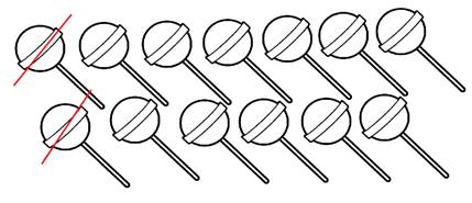 Na rysunku przed skreśleniem znajduje się 13 lizaków, dlatego ich liczbę po skreśleniu dwóch możesz obliczyć z odejmowania: 13 lizaków – 2 lizaki = 11 lizaków.