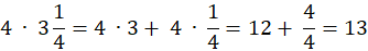 Obliczając iloczyn liczby naturalnej z liczbą mieszaną, rozdziel liczbę mieszaną na sumę liczby całkowitej i ułamka właściwego, a następnie oblicz iloczyn z każdym składnikiem powstałej sumy.