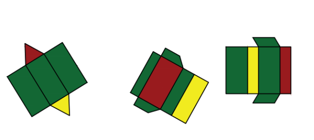 W 1. przypadku trójkąt – czerwony, reszta ścian – zielony. W 2. przypadku największa ściana prostokątna – czerwony, ściany podstaw - zielony. W 3. przypadku prawy prostokąt – czerwony, równoległoboki – zielony.