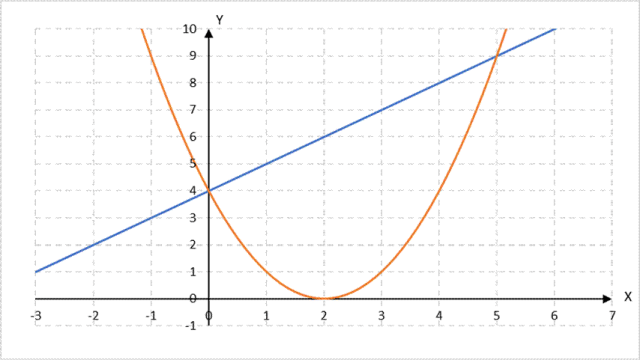 Punkt przecięcia prostych to (0, 4) oraz (5, 9).