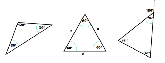 W trójkącie równoramiennym kąty przy podstawie mają równe miary. Odejmij od 180° kąt przy ramionach, a otrzymasz łączną miarę 2 kątów przy podstawie: