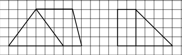 Trapez 1 podzielono na trójkąt o podstawie 3 cm i wysokości 2 cm oraz na trapez o podstawach 2 cm i 1 cm oraz wysokości 2 cm. Trapez 2 podzielono na prostokąt i trójkąt prostokątny o przyprostokątnych 2 cm i 2 cm.