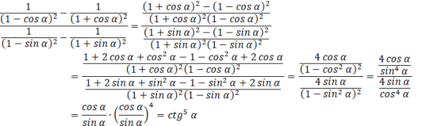 Przekształć prawą stronę. Sprowadź licznik i mianownik do wspólnych mianowników i rozwijając nawiasy zauważ jedynkę trygonometryczną