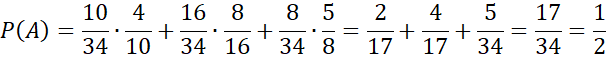 Wyznacz prawdopodobieństwo wylosowania kuli czarnej, jeśli w pierwszej urnie są 6 kul białych i 4 czarne, a w drugiej – po 8 kul białych i czarnych, a w trzeciej – 5 kul białych i 3 czarne i wybieramy losowo urnę, a z niej jedną kulę.