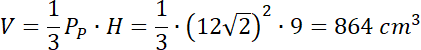 Wyznacz objętość ostrosłupa prawidłowego czworokątnego o wysokości równej 9, jeśli cosinus kąta między wysokością tego ostrosłupa, a wysokością jego ściany bocznej jest równy 0,6.