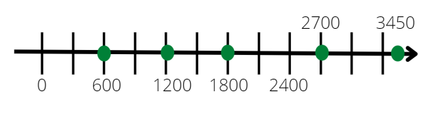 Podziałka na osi liczbowej to 300, czyli przesunięcie o jedną kreskę w prawo zwiększa liczbę o 300.