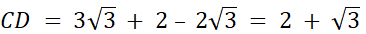 Policz ile kratek mają boki trójkątów równobocznych (ABC – 6, mniejszy – 4). Oblicz wysokość trójkąta większego i dodaj do niej 2. Następnie, aby otrzymać długość CD, odejmij od całości wysokość trójkąta mniejszego.