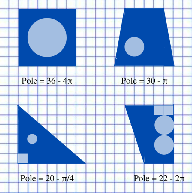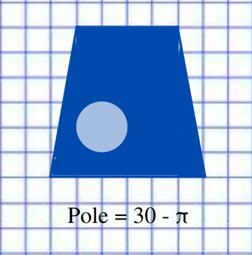 Pole całej figury jest równe 30, więc musisz pomniejszyć je o π. Zamaluj w związku z tym cały obszar figury poza kołem o polu równym π (czyli kołem o promieniu 1).