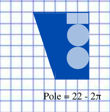 Pole trapezu jest równe 24, więc by otrzymać pole równe 22 musisz zamalować trapez bez 2 kratek (każda o polu 1). Aby pomniejszyć pole o 2π, najlepiej jeśli zamalujesz obszar pomniejszony o 2 koła o polu równym π (czyli dwa koła o promieniu równym 1).