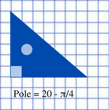 Pole trójkąta jest równe 21, więc musisz zamalować cały trójkąt poza 1 kratką oraz kołem o polu równym π/4, czyli kołem o promieniu równym ½ π.