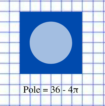 Pole całego kwadratu to 36. Aby obszar był mniejszy o 4π, zamaluj całą figurę poza kołem o promieniu 2 (którego pole to 22π = 4π).