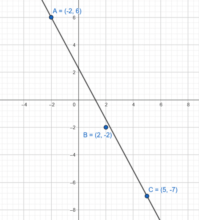 Sprawdź, czy punkty A(-2,6), B(2,-2), C(5,-7) leżą na jednej linii.