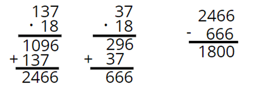 18 ∙ 137 – 18 ∙ 37 = 2466 – 666 = 1800