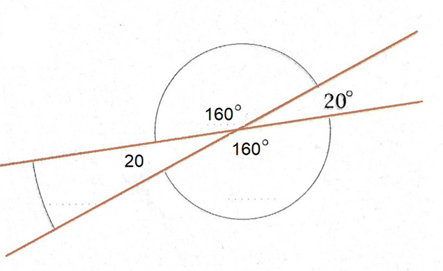 Dwie proste przecinające się implikują powstanie katów przystających, których wartości są równe. Kąt rozwarty ma wartość 160 stopni, ponieważ dokładnie tyle brakuje do dopełnia w widocznym kącie półpełnym.