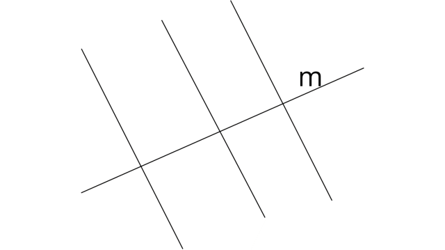 Przyłóż ekierkę do prostej m i przytrzymaj, żeby się nie przesunęła. Do drugiego ramienia ekierki przyłóż linijkę tak, aby się nie przesunęła. Ekierkę odłóż i wzdłuż krawędzi linijki narysuj prostą. Podobnie postąp z pozostałymi prostymi.