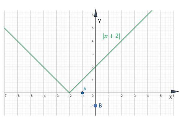 Po narysowaniu wykresu funkcji |x + 2| widać, że zarówno x = –1 [punkt A(–1,0)], jak i y = –1 [punkt B(0,–1)] nie znajduje się na wykresie funkcji, co dowodzi, że równanie jest sprzeczne.
