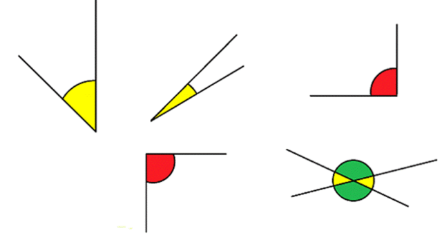Pokoloruj kąty ostre na zioło, rozwarte na zielono, a proste na czerwono.